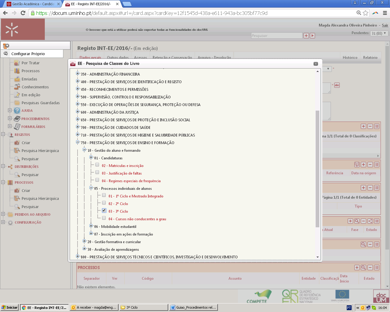 • The thesis admission request via docUM must follow this structure in the “subject” field: “Pedido de admissão a tese ao PDXX_nome completo do aluno_ idXXXX_ano letivo” and be classified as follows: